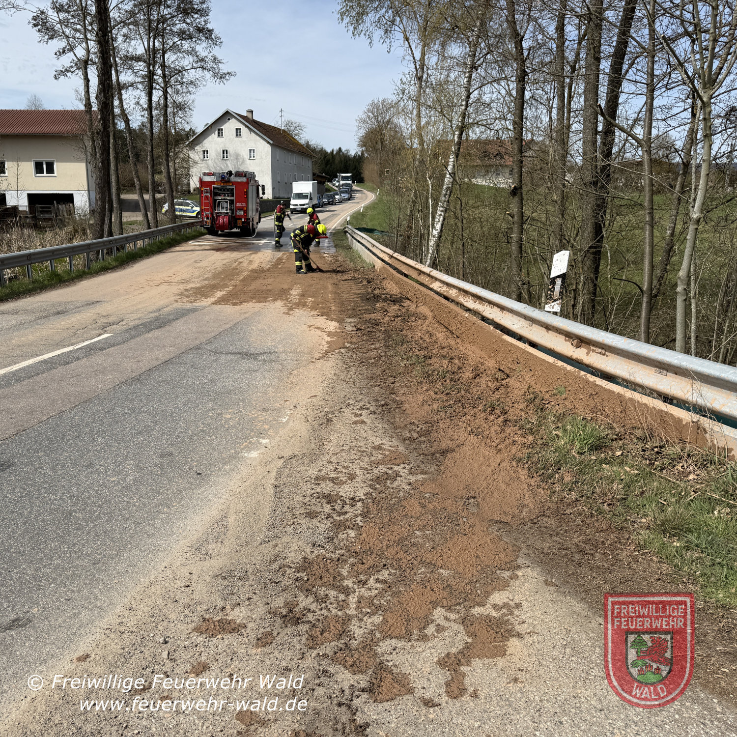 Am Donnerstag, den 09.04.2026, wurde die Feuerwehr Wald gegen 11:30 Uhr zu einer Straßenreinigung auf die Staatsstraße 2145 bei Gumping alarmiert. In einer scharfen Kurve hatte ein Fahrzeug Erdreich verloren, wodurch Fahrbahn, Bankett und Leitplanke verunreinigt wurden.